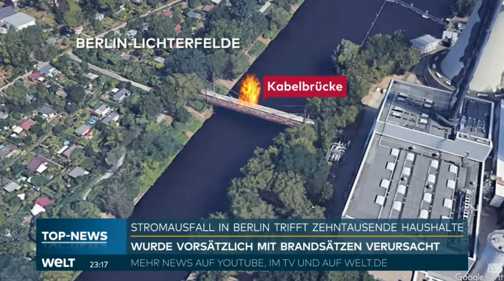 [Sabato 3 gennaio, verso le 6:30 del mattino, il gruppo «Vulkangruppe : Den Herrschenden den Saft abdrehen» (Gruppo Vulcano: togliere la corrente ai dominanti) ha dato fuoco a diversi cavi di media e alta tensione della centrale a gas di Berlino, situata a Lichterfelde. Ciò ha causato l’interruzione della fornitura di energia elettrica a 2.200 aziende e 45.000 famiglie (ovvero 100.000 persone) in diversi quartieri esclusivi della zona sud-ovest della capitale tedesca: Lichterfelde, Zehlendorf, Nikolassee e Wannsee. In concreto, una ventina di linee da 110 kV sono state colpite da questo incendio doloso nel punto in cui attraversavano il canale di Teltow su un ponte dedicato, scollegando la parte “elettricità” della centrale a gas dalla rete berlinese, mentre la parte “riscaldamento urbano” è rimasta intatta. L’operatore municipale Stromnetz Berlin ha immediatamente adottato soluzioni alternative per ripristinare l’energia elettrica a 7.000 abitazioni e 150 aziende prioritarie, ma ha annunciato che il ripristino completo della rete non sarà effettivo prima di giovedì prossimo, 8 gennaio.